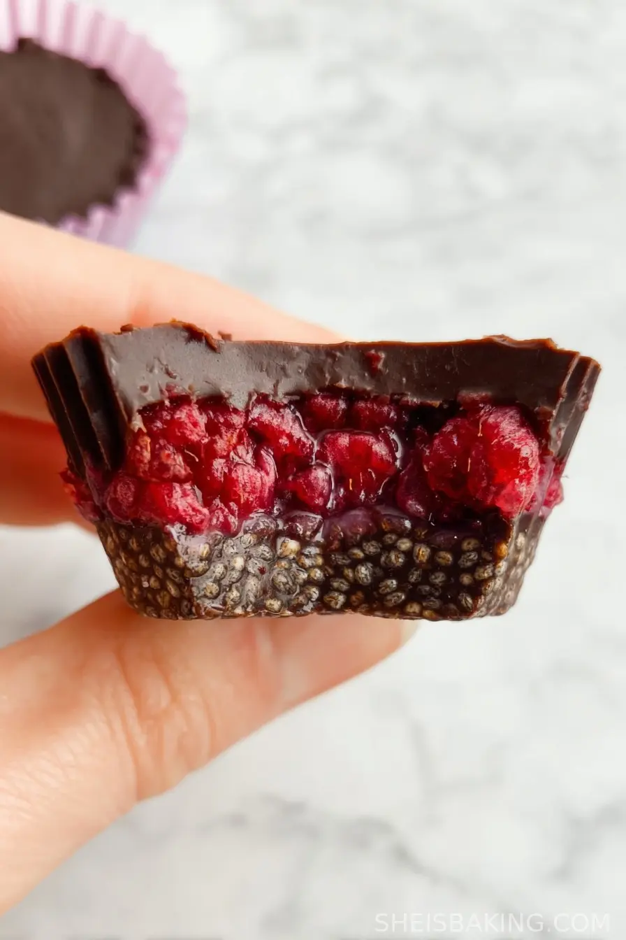 - Once the chocolate has set, remove the muffin tin from the freezer. Spoon 1 tablespoon of the cooled, thickened raspberry-chia filling onto each chocolate layer, gently spreading it out to cover the base completely. Take care to create a smooth and even layer so every bite contains both chocolate and raspberry. Return the tin to the freezer for an additional 5 minutes, helping the raspberry layer firm up and hold its shape.