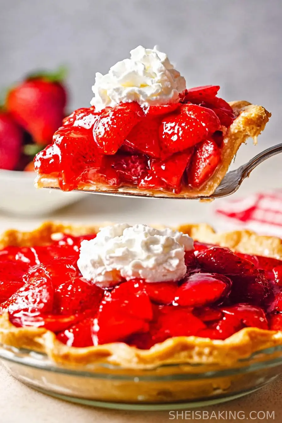 Fresh Strawberry Pie makes an eye-catching centerpiece at picnics, spring gatherings, baby showers, and summer BBQs, especially when displayed on a pedestal cake stand surrounded by extra whole strawberries.